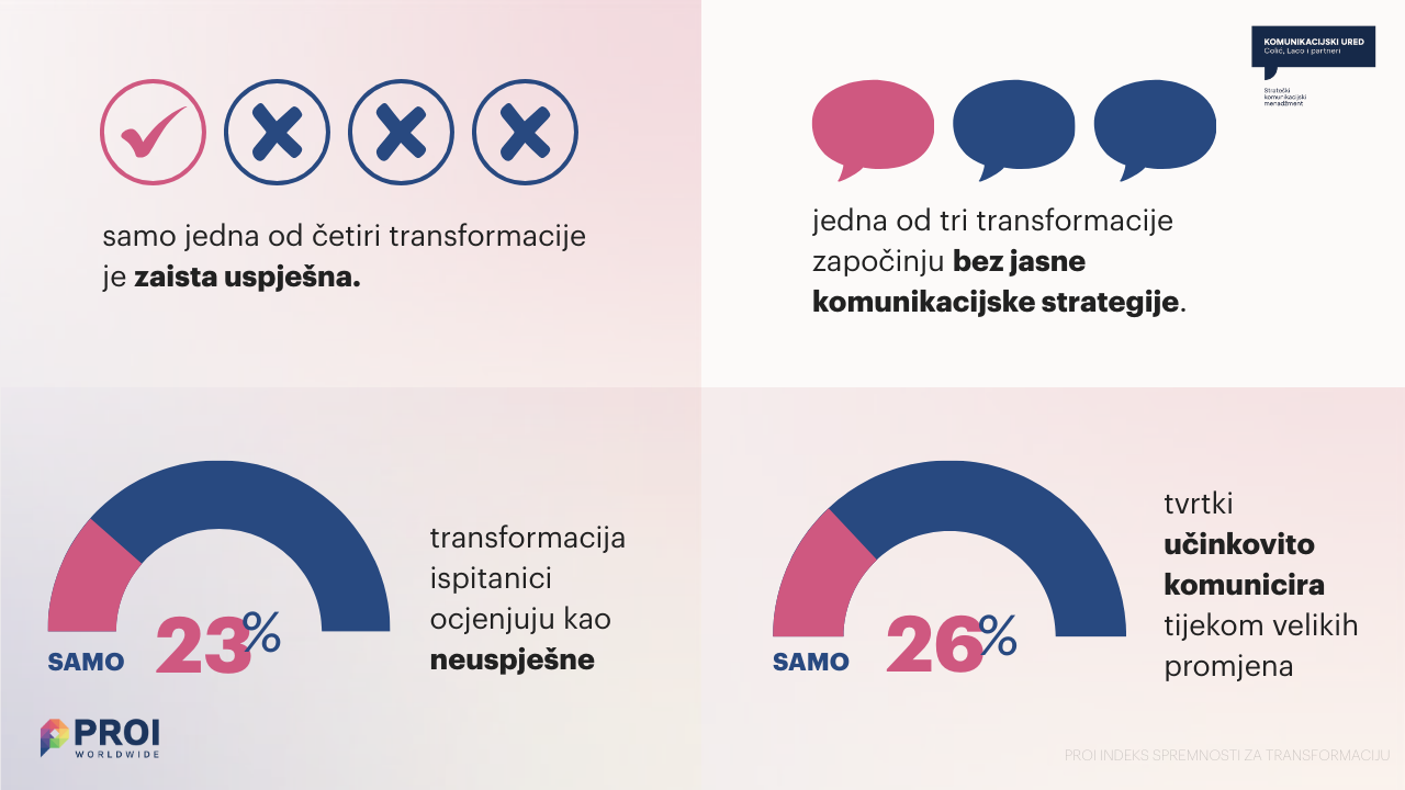 Poslovne transformacije danas su pravilo, a ne iznimka. No, prema upravo objavljenom paneuropskom izvješću u koje je bilo uključeno više od 650 lidera iz 30 zemalja, tek svaka četvrta završava uspješno. PROI Worldwide Indeks spremnosti za transformaciju 2025. pokazuje da je za uspjeh ključna pravovremena, transparentna i dvosmjerna komunikacija, koja jasno prepoznaje različite potrebe onih s kojima lideri promjena razgovaraju. Iako je to tako, u praksi samo 26 posto tvrtki učinkovito komunicira tijekom velikih promjena.